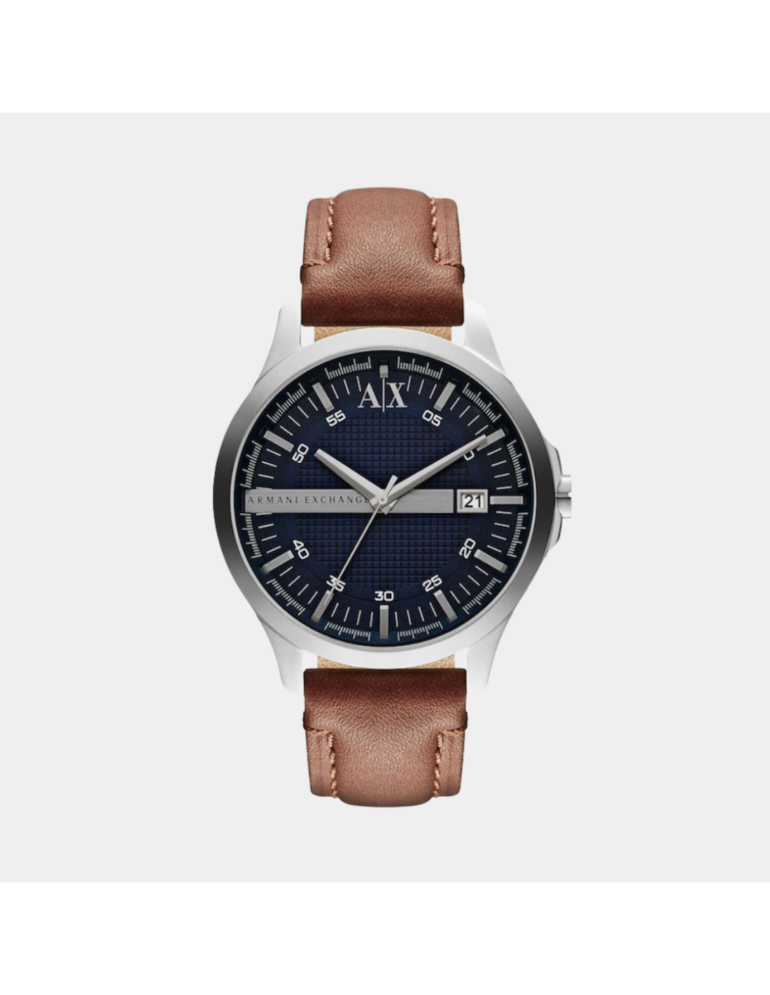 The Armani Exchange AX2133 is a stylish men’s analog watch that blends classic design with modern flair. It features a 46 mm stainless steel case paired with a rich brown genuine leather strap for comfortable everyday wear. The watch boasts a navy blue textured dial with silver‑tone hands, index markers, and a practical date display at 3 o’clock, all powered by reliable quartz movement for accurate timekeeping. Protected by a mineral crystal, the AX2133 is water‑resistant up to 50 meters (5 ATM), making it suitable for daily activities and light splashes. With its clean, timeless look and quality materials, this timepiece transitions seamlessly from casual to refined outfits, embodying Armani Exchange’s signature contemporary aesthetic.