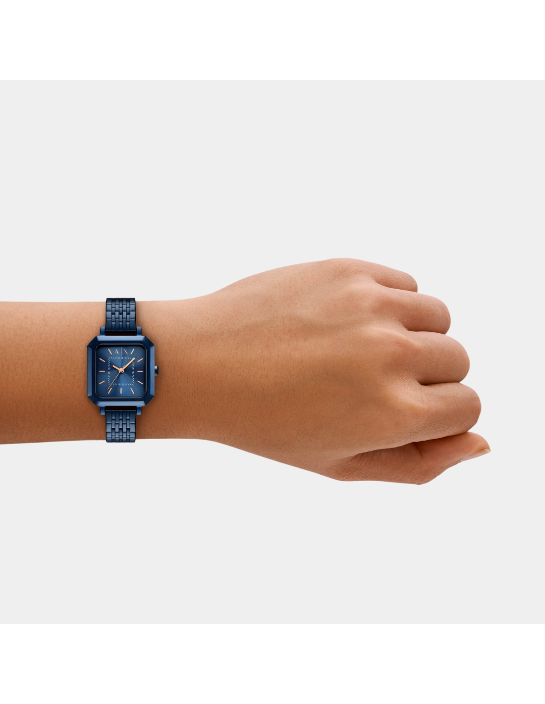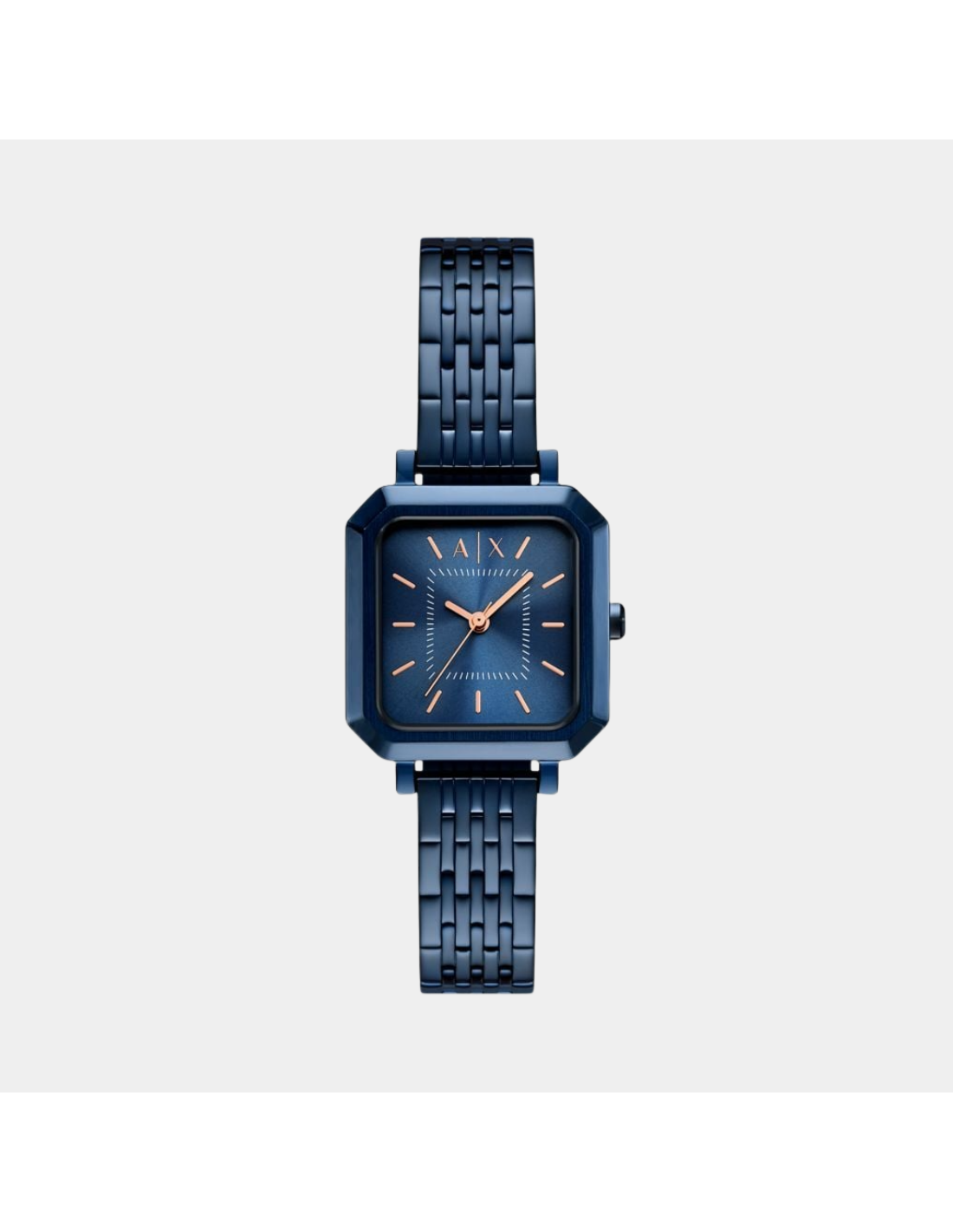 The Armani Exchange AX5730 is a stylish women’s analog watch from the Leila collection that blends modern elegance with everyday practicality. This timepiece features a 27 mm deep blue square stainless-steel case and matching bracelet for a sleek, monochromatic look that stands out on the wrist. Powered by a reliable three-hand quartz movement, the minimalist dial offers clear timekeeping with precision and simplicity. Protected by a mineral crystal, it’s durable against bumps and daily wear. The watch is water-resistant up to 50 meters (5 ATM) — splash-proof and suitable for brief surface swimming or rain exposure. Its refined blue hues and compact silhouette make it ideal for both casual everyday outfits and dressier occasions, combining fashion-forward design with functional reliability